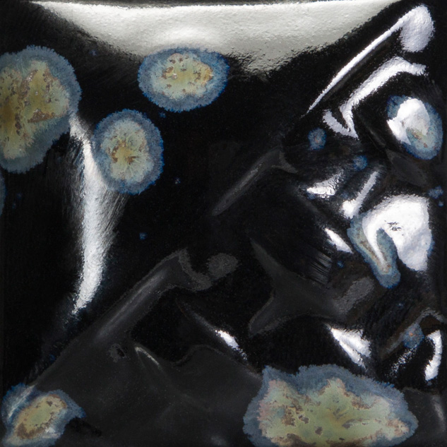 Night Moth er en opaque, blank sort glasur med krystaller, der folder sig ud i salviegrønne og grå nuancer.